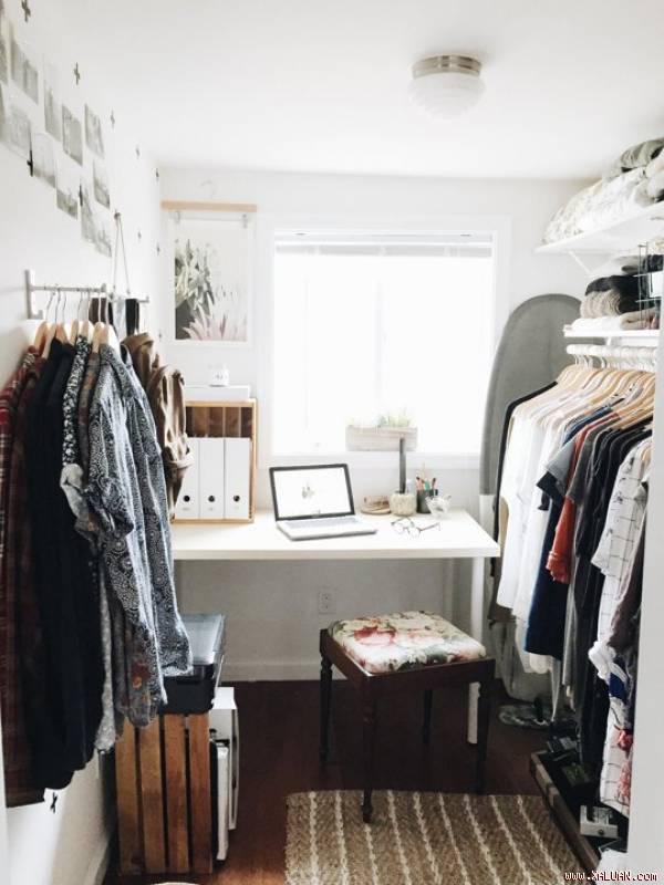Kết hợp một không gian làm việc và tủ quần áo không phải là một nhiệm vụ dễ dàng, nhưng Shelbie hoàn toàn kết hợp được cả 2 trong 1 không gian. Giữ phòng màu trắng và trung tính để giải thoát khỏi cảm giác ngột ngạt. Những thanh treo song song và vuông góc với tường giúp treo được hàng tấn quần áo.