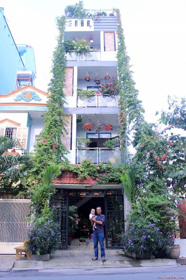 Khi vừa làm nhà xong vào năm 2012, gia đình ông Thường (TP HCM) đã bắt đầu trồng hoa, rau khắp các tầng. Trước nhà là cây chiều tím mọc thành bụi, sử quân tử leo từ mặt đất lên tầng 4. Ban công tầng nào cũng có những giỏ hoa và vài chậu cây cảnh như hoa sứ, chuối cảnh.